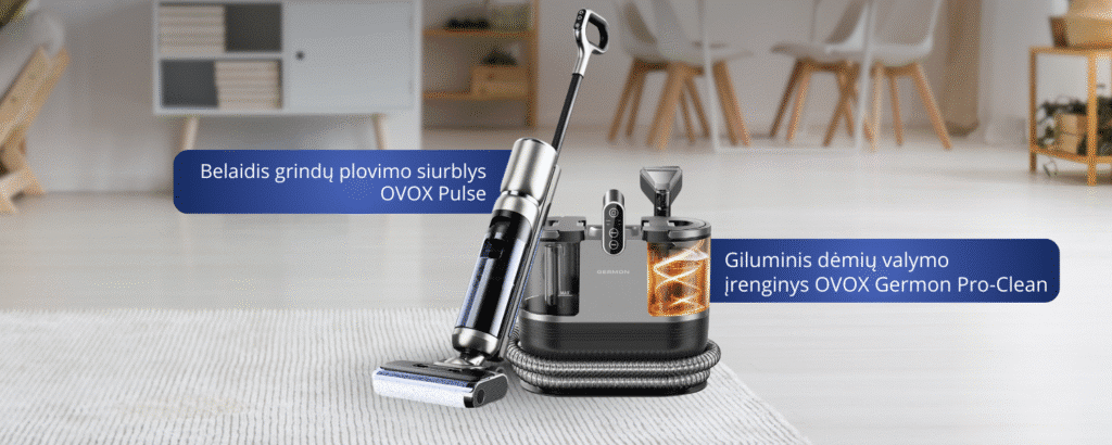 Užtikrinkite visapusišką namų švarą su belaidžiu grindų plovimo siurbliu OVOX Pulse bei giluminiu dėmių valymo įrenginiu Germon Pro-Clean!