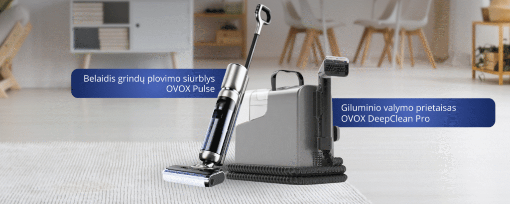 Užtikrinkite visapusišką namų švarą su belaidžiu grindų plovimo siurbliu OVOX Pulse bei giluminiu valymo įrenginiu Germon OVOX DeepClean Pro!