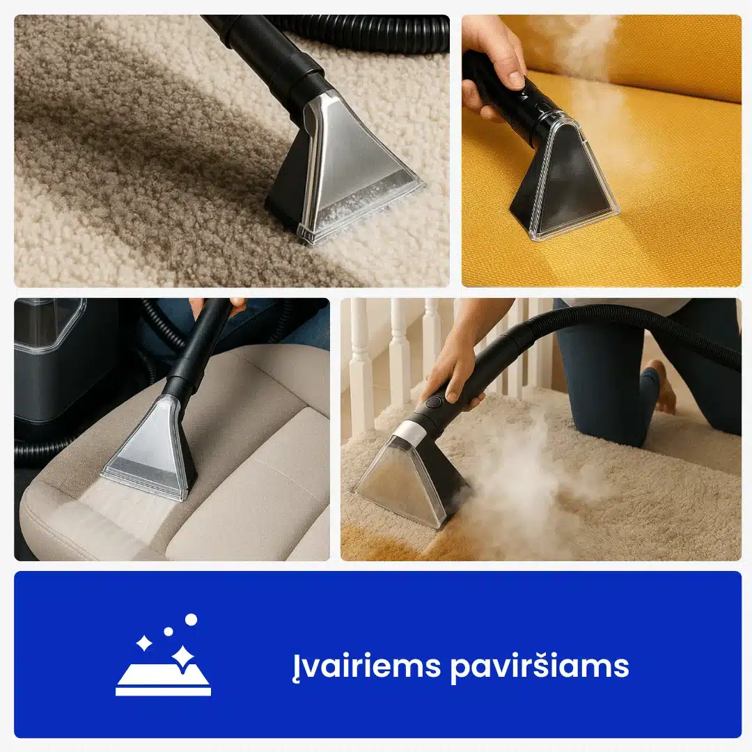 Naudojant pažangią garų ir siurbimo technologiją net sunkiausiai įveikiamos įvairių paviršių dėmės pašalinamos lengvai, nenaudojant cheminių medžiagų.