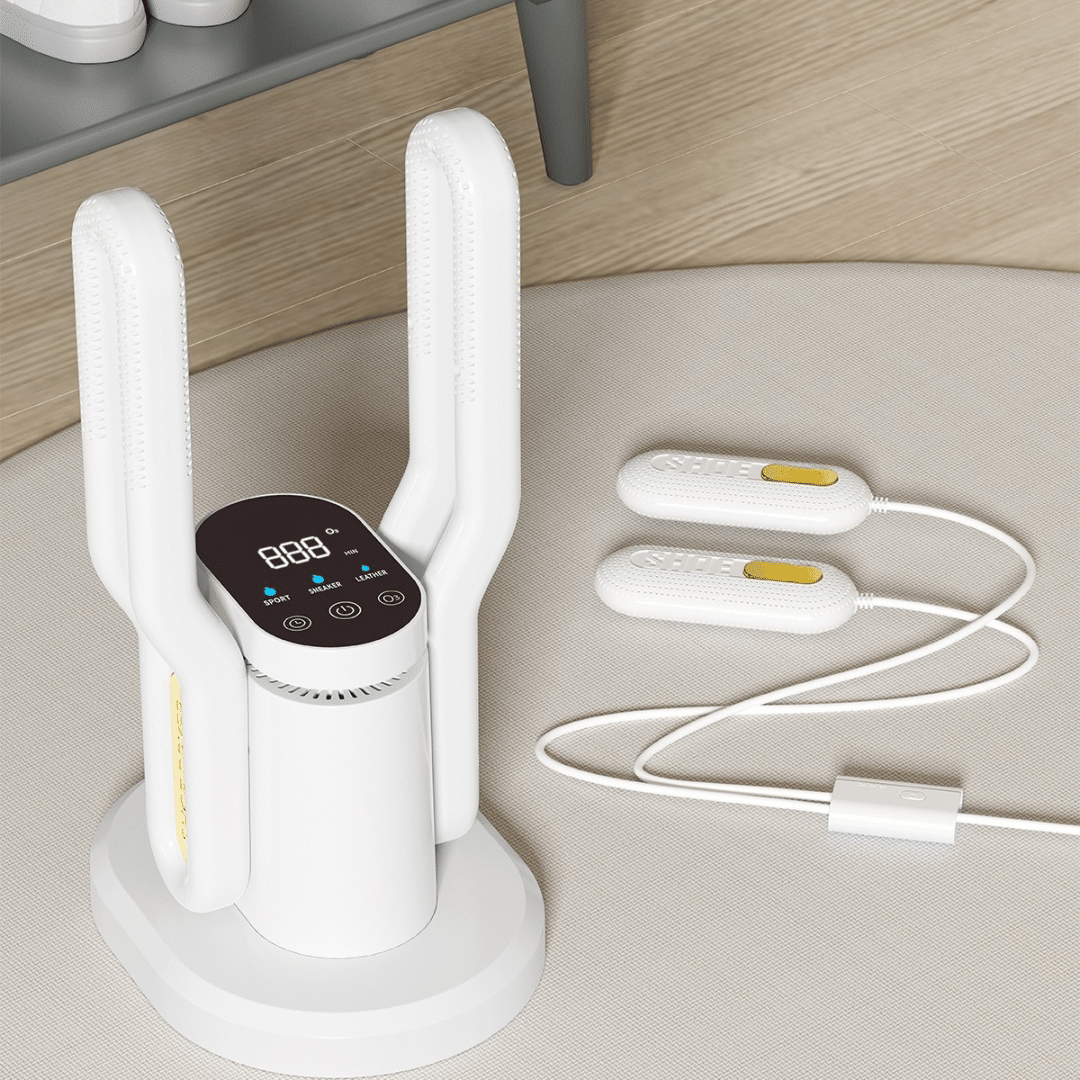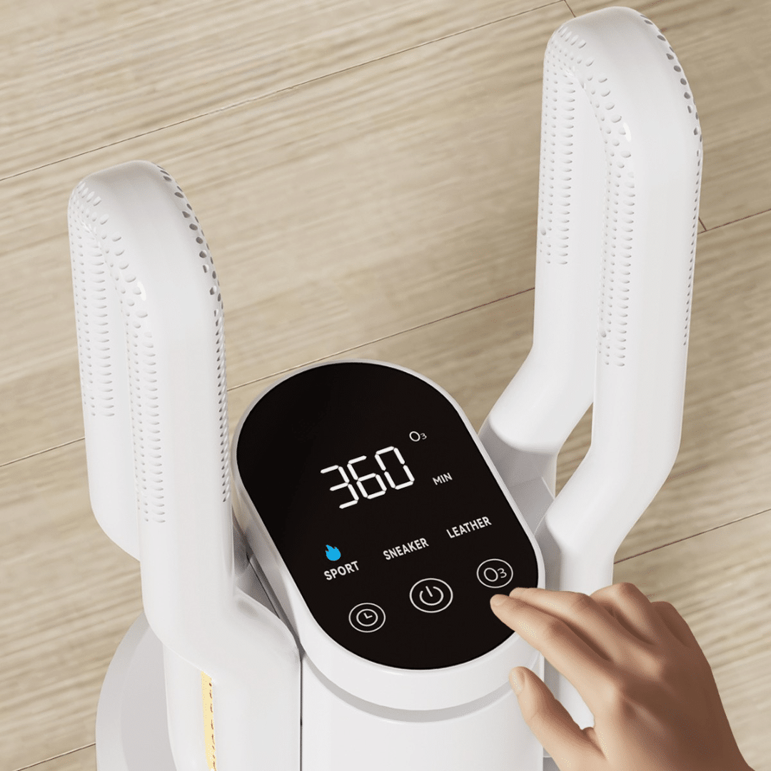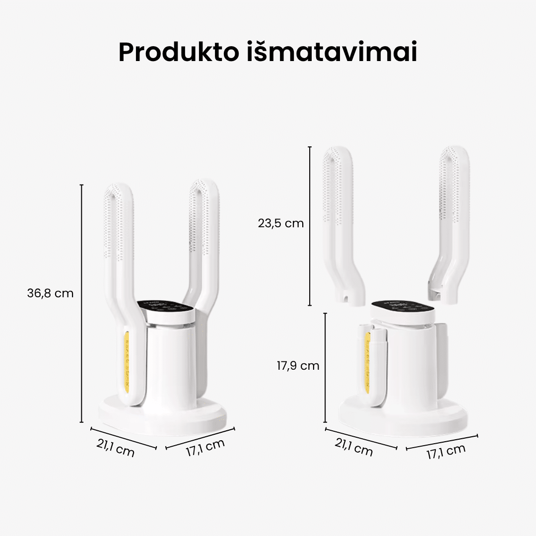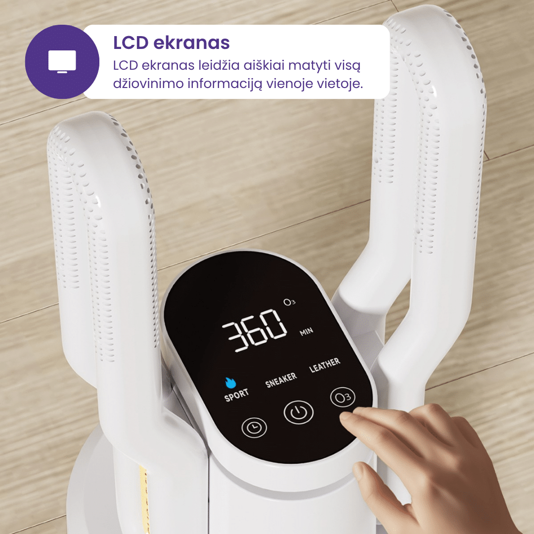 - Išmanus reguliavimas: džiovyklė automatiškai palaiko saugią temperatūrą, todėl dauguma batų ir audinių džiūsta saugiai ir be kvapų.