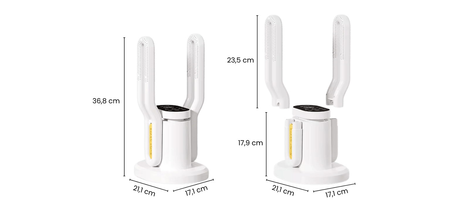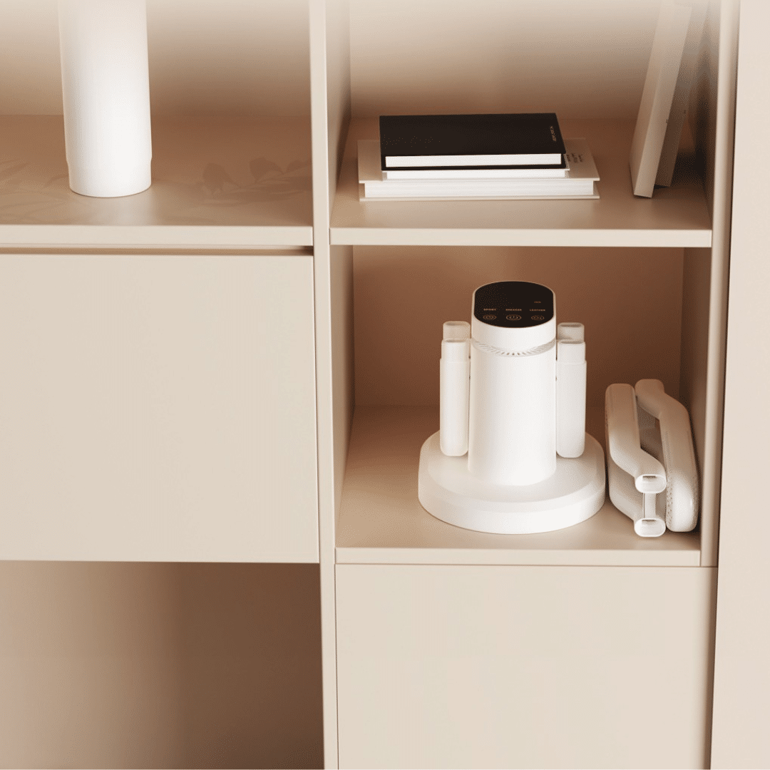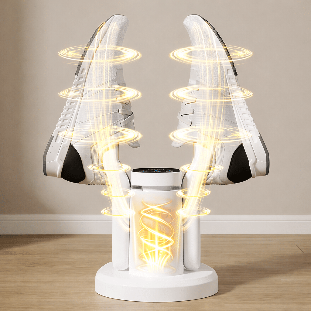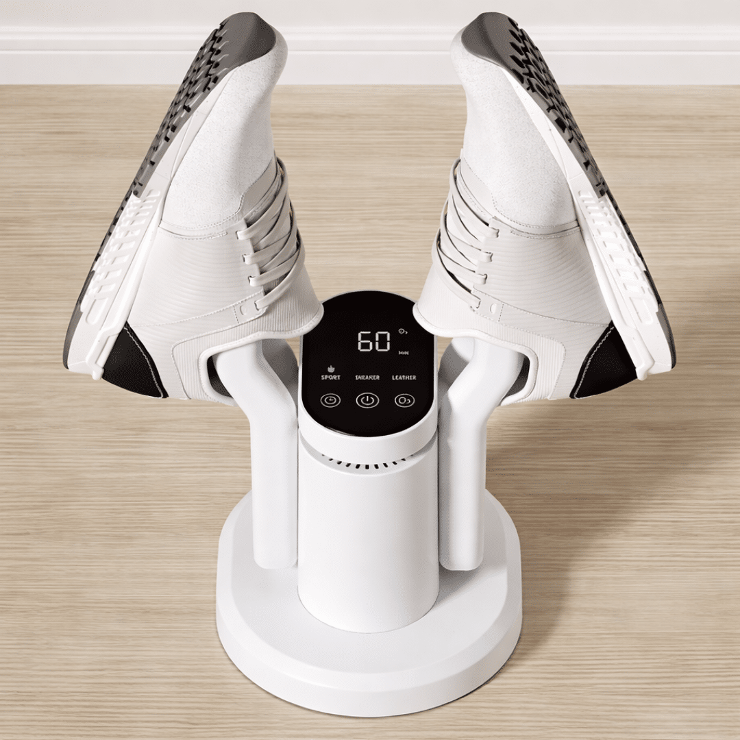- Išmanus reguliavimas: džiovyklė automatiškai palaiko saugią temperatūrą, todėl dauguma batų ir audinių džiūsta saugiai ir be kvapų.