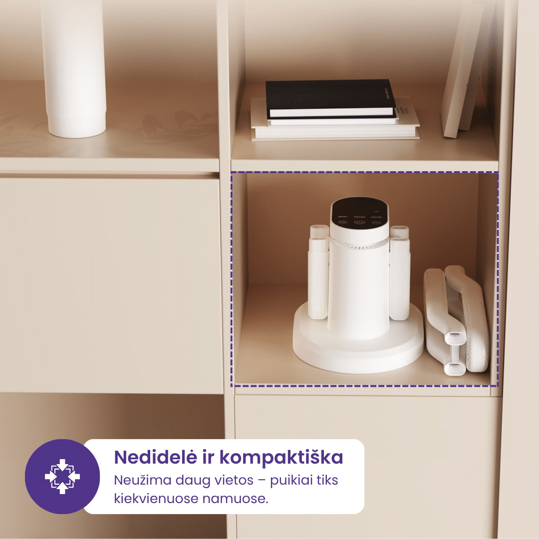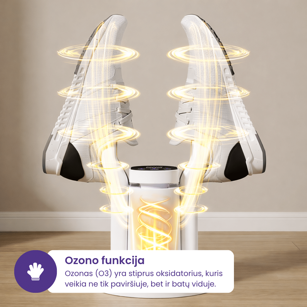 Įprastas džiovintuvas tik sausina, o ozonas papildomai dezinfekuoja, todėl batai tampa higieniškesni ir gaivesni.
