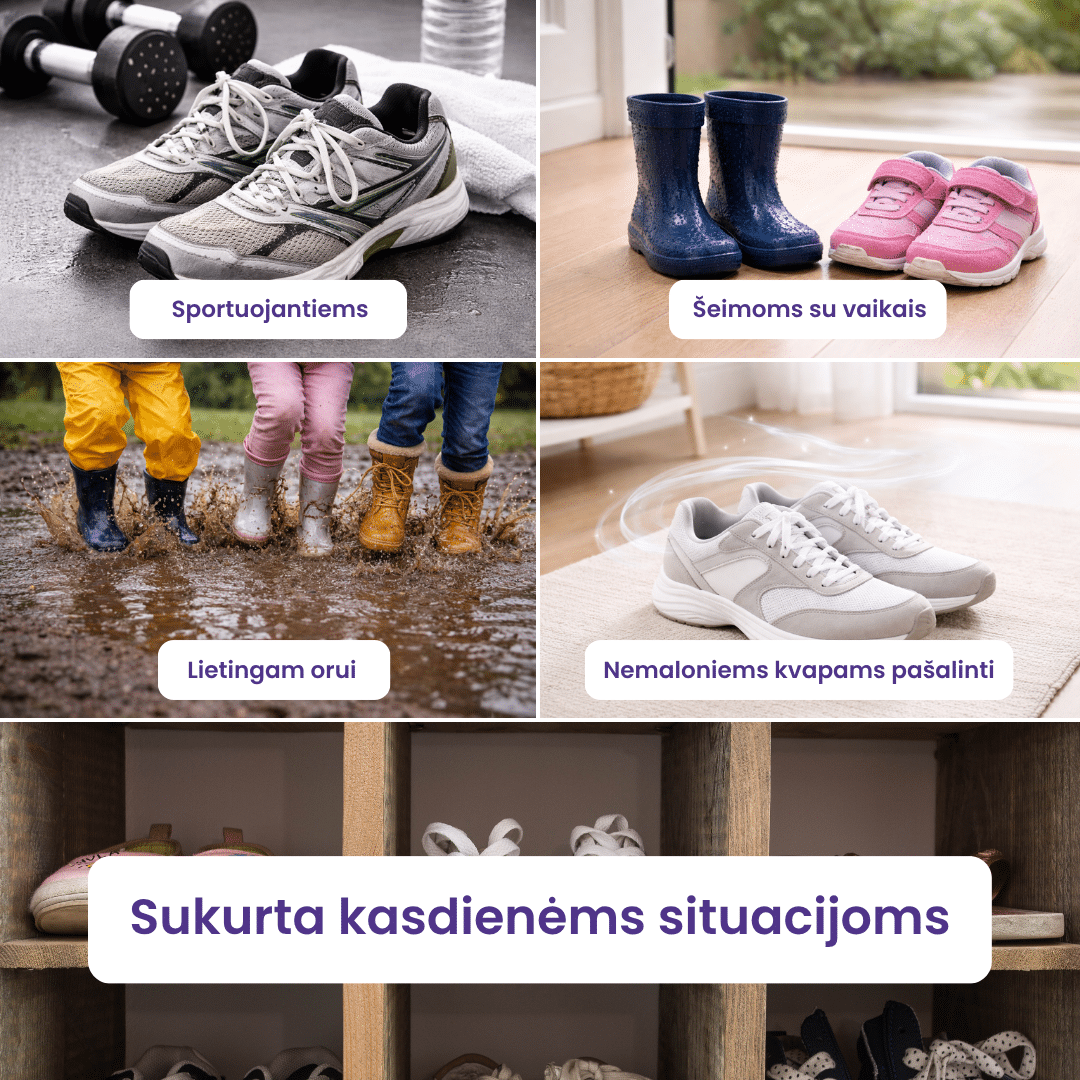 Naudinga po lietaus, šlapdribos ar sniego, kai avalynė sudrėksta iš vidaus ir natūraliai džiūtų per ilgai.