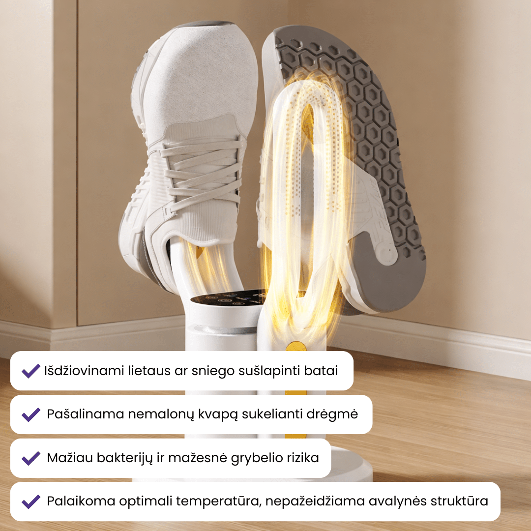 Palaikomas saugus šilumos lygis, kad batai išdžiūtų efektyviai, o jų forma ir struktūra nepakistų.