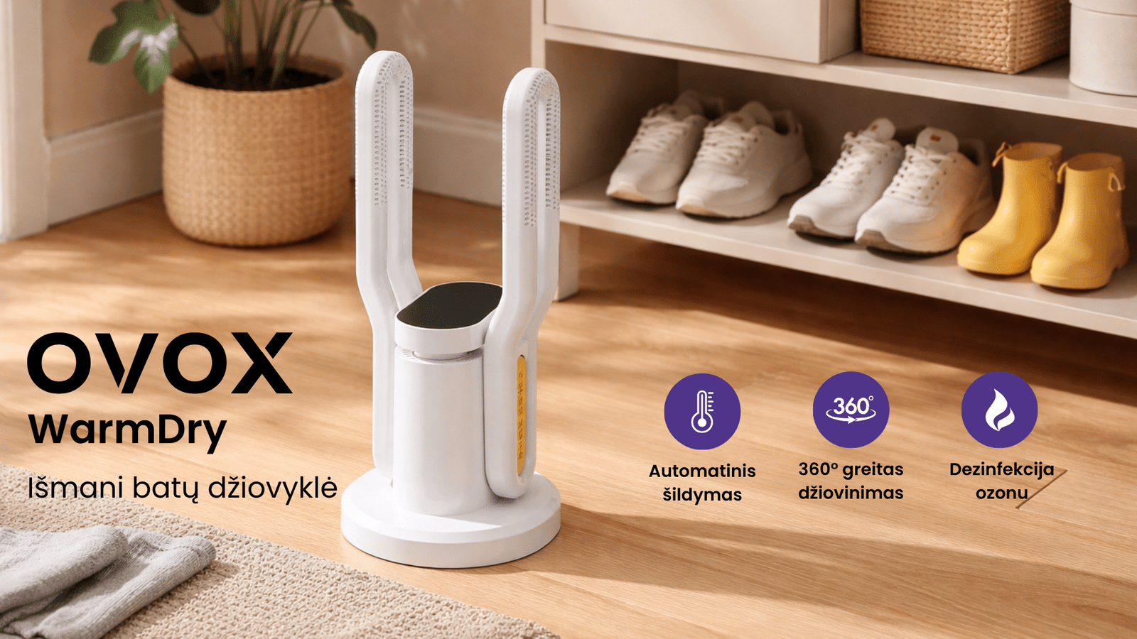Džiovinimo procesas su OVOX WarmDry yra išmanus: oras paskirstomas tolygiai, šiluma reguliuojama automatiškai, o papildoma ozono funkcija leidžia džiaugtis švaresne ir gaivesne avalyne kasdien.