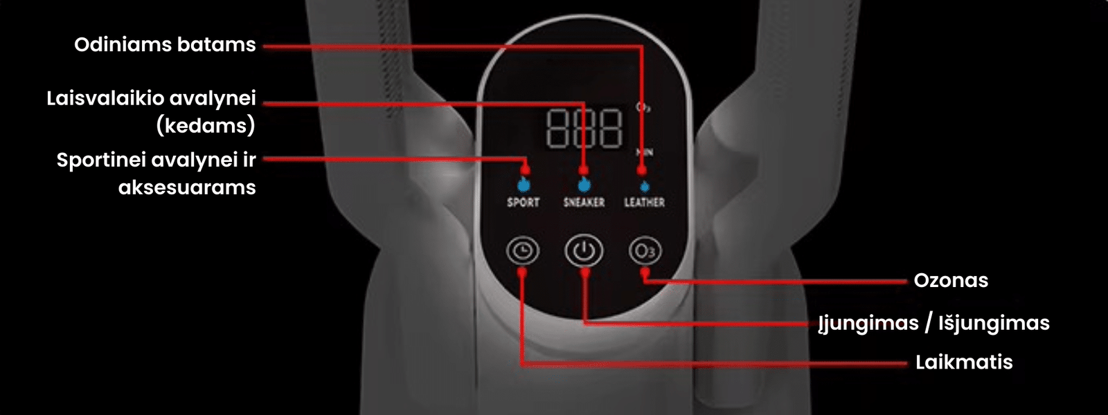 O3 funkcija naikinamos bakterijos, grybelis ir nemalonūs kvapai, todėl batai ne tik išdžiūsta, bet ir tampa higieniškesni.