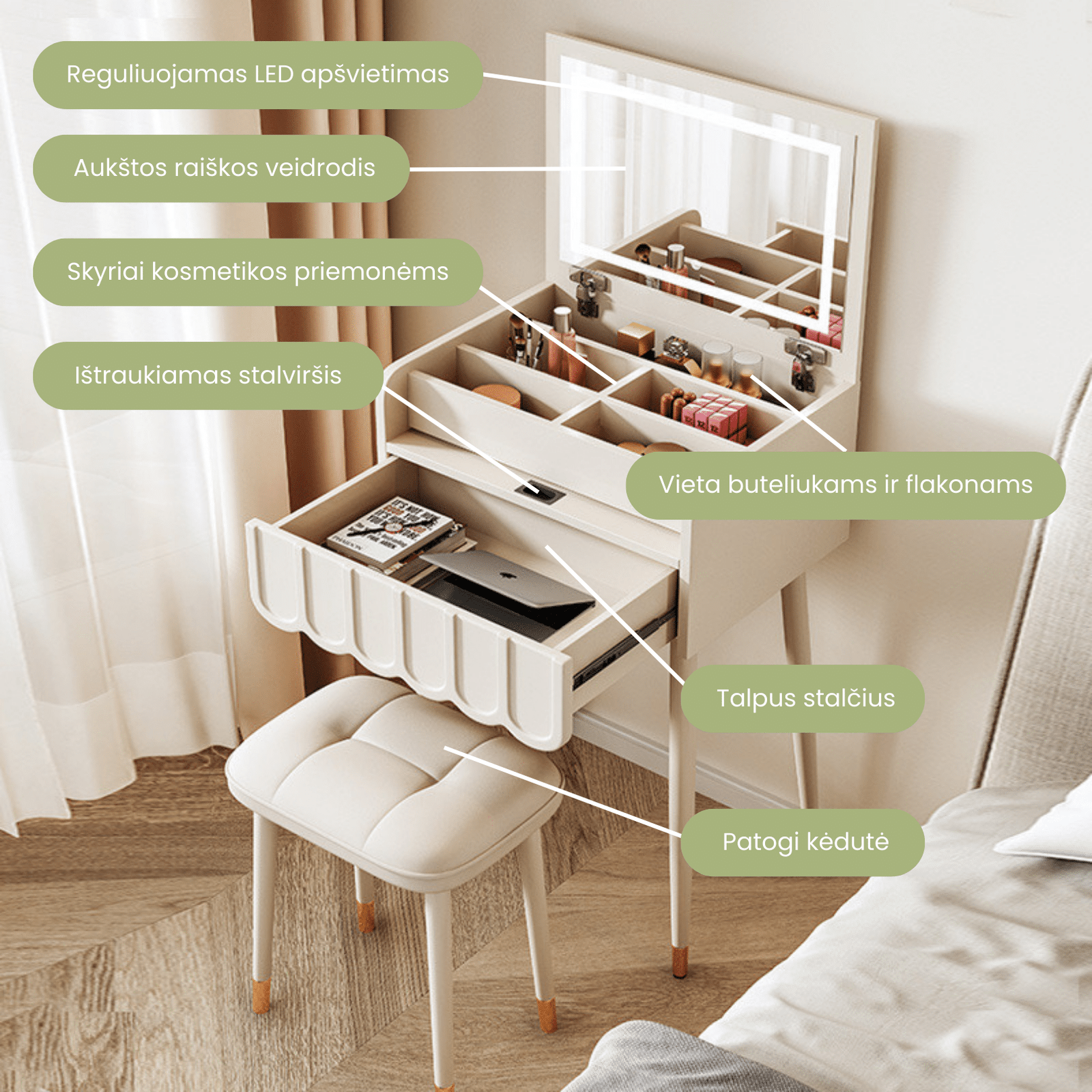 Išmanus staliuko dizainas su pertvaromis, giliu stalčiumi ir teleskopiniu stalviršiu leidžia patogiai susidėti tiek kosmetiką, tiek darbo priemones. Reguliuojamas LED apšvietimas ir didelis HD veidrodis užtikrina komfortą grožio ir darbo ritualams.
