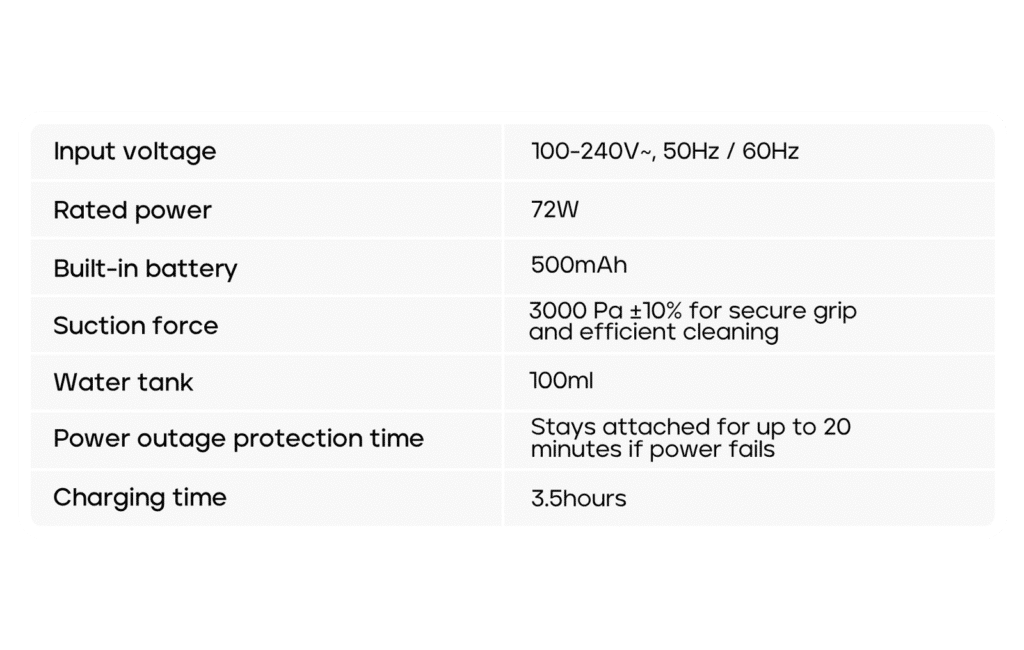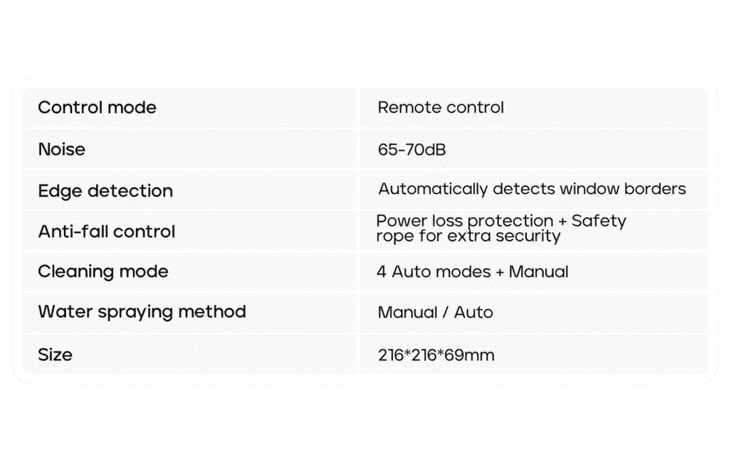 Langų valymas naudojant robotą yra visapusiškai saugus procesas. 72 W vakuuminis variklis prisitvirtina ir prisisiurbia net 3000 PA galia, kuri leidžia tvirtai prisitvirtinti robotui prie lango. Taip pat roboto saugumą užtikrina avarinio laikymosi sistema ir apsauginė virvė. Nutrūkus elektros srovei robotas iki 20 minučių išlieka prisitvirtinęs prie paviršiaus. Praėjus ~20 minučių ir robotui nuslydus nuo paviršiaus apsauginė virvė apsaugos jį nuo kritimo. Ji neleis jam nukristi ant žemės ir išlaikys ore, kol galėsite pasirūpinti robotu.