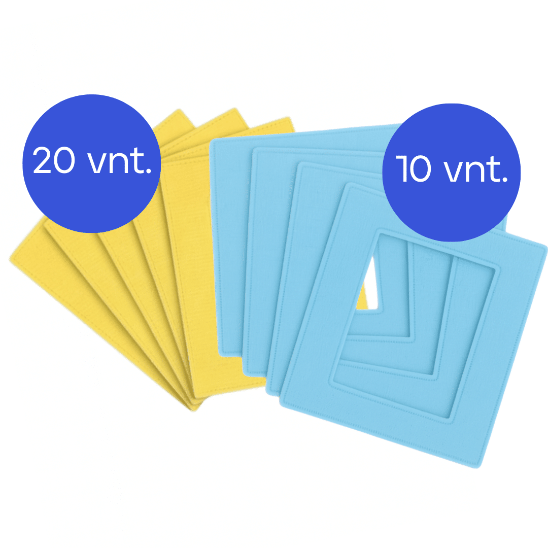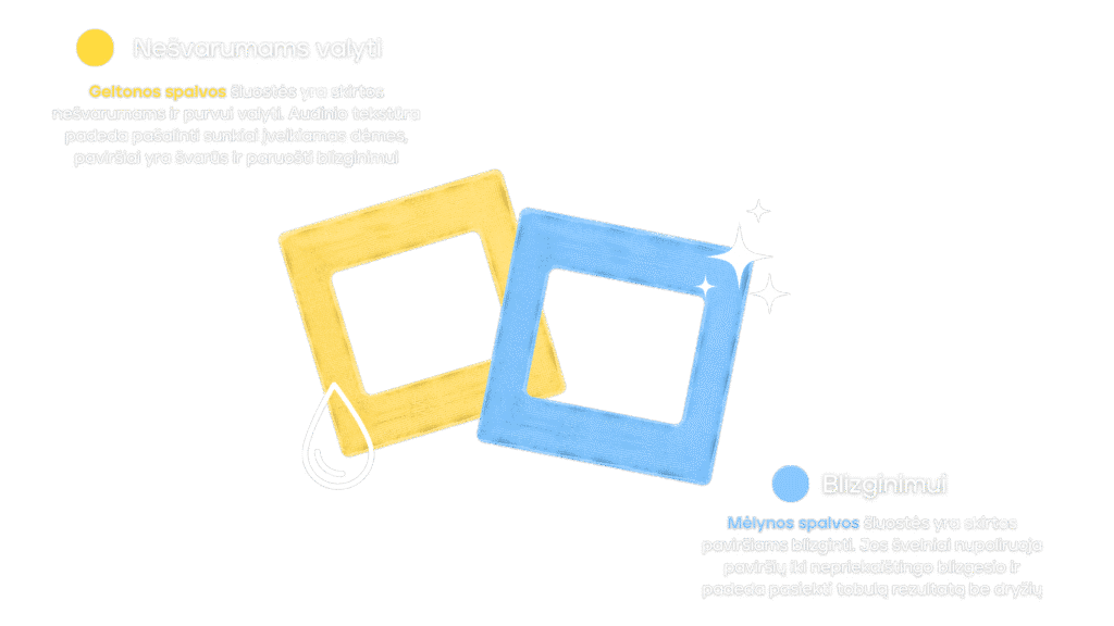 Geltonos šluostės yra skirtos sausam ir drėgnam paviršių valymui, o mėlynos spalvos šluostės – nuvalytiems paviršiams blizginti.