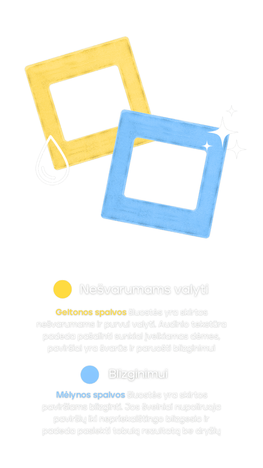 Geltonos - nešvarumams valyti, mėlynos - blizginimui