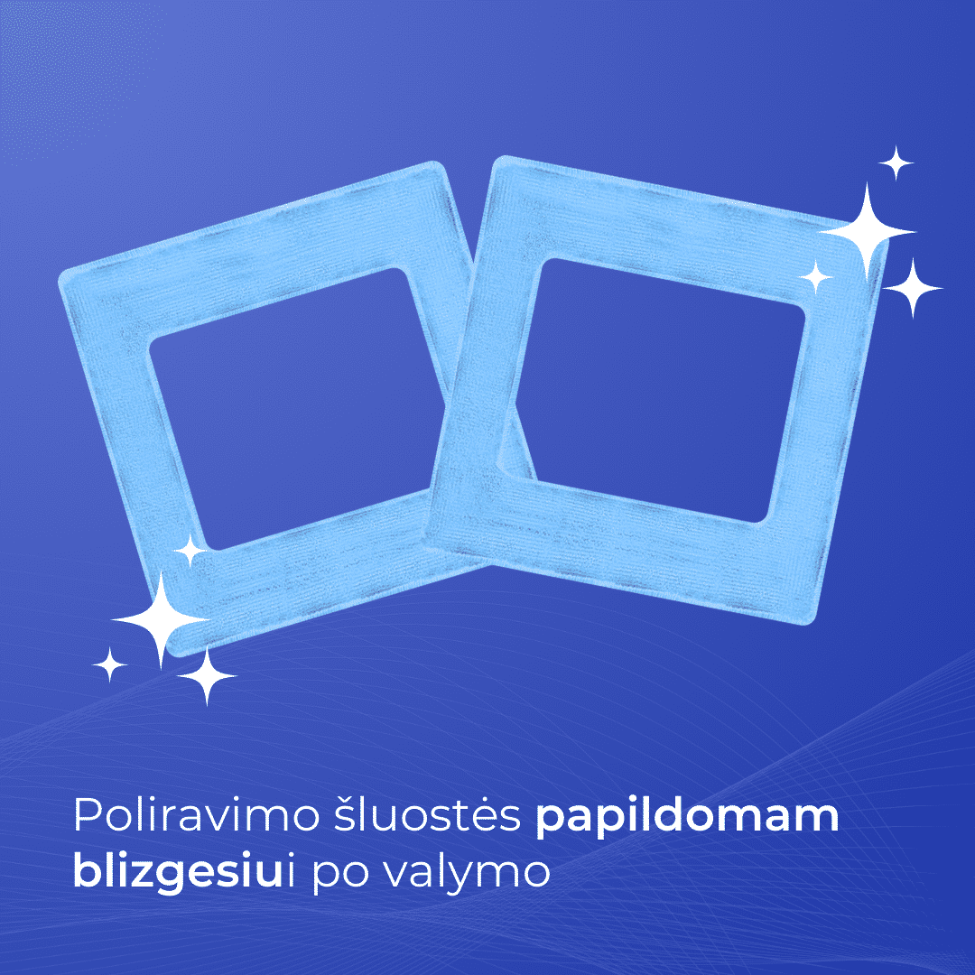 Paskutiniam etapui naudokite mėlynos spalvos poliravimo šluostę, pagamintą iš specialios tekstūros, kuri sustiprina poliravimo efektą. Purškimo funkcijos įjungti nereikia. Toks sausas valymas padeda pašalinti po drėgno valymo likusius dryžius ar aprasojimą, todėl stiklas tampa visiškai skaidrus ir be dryžių.