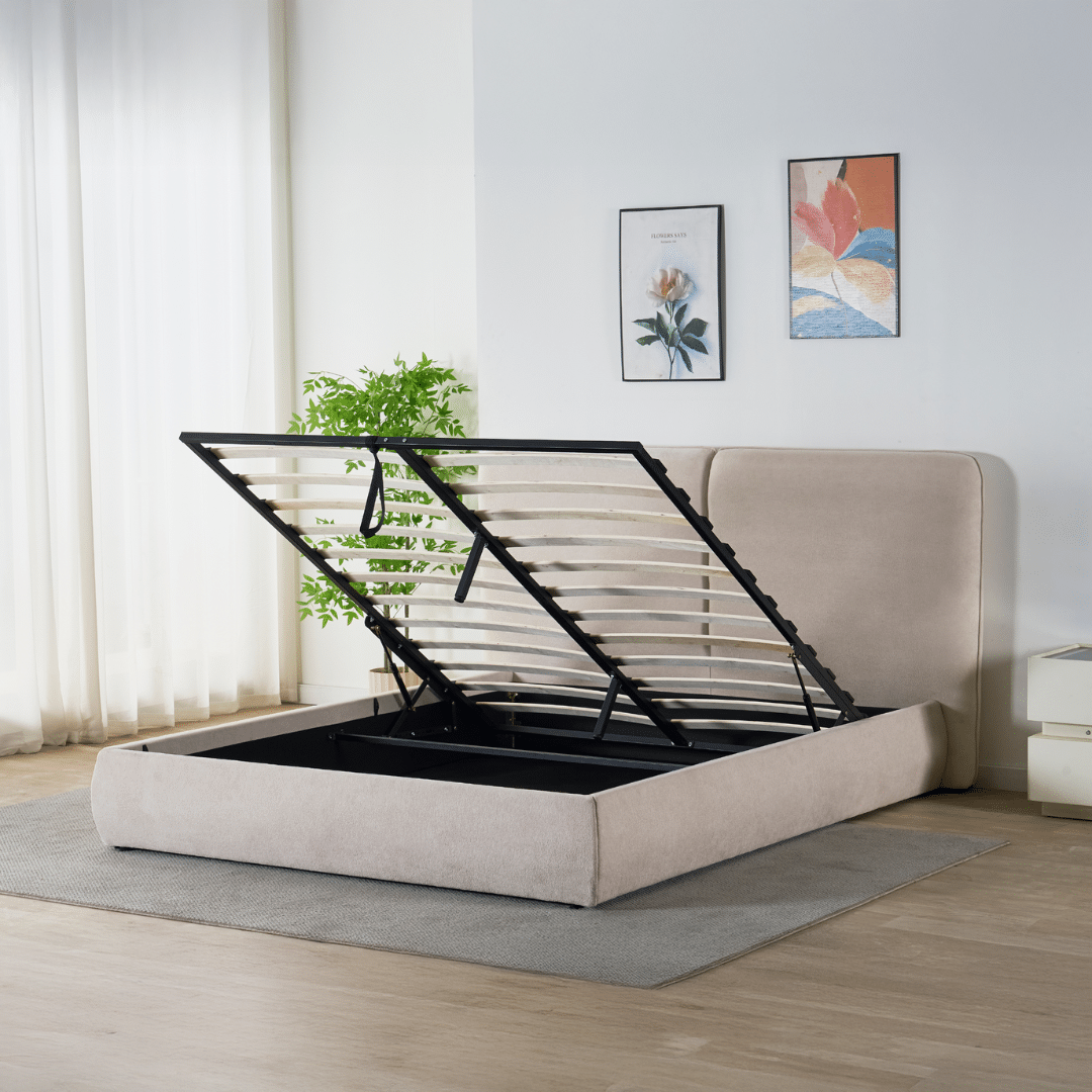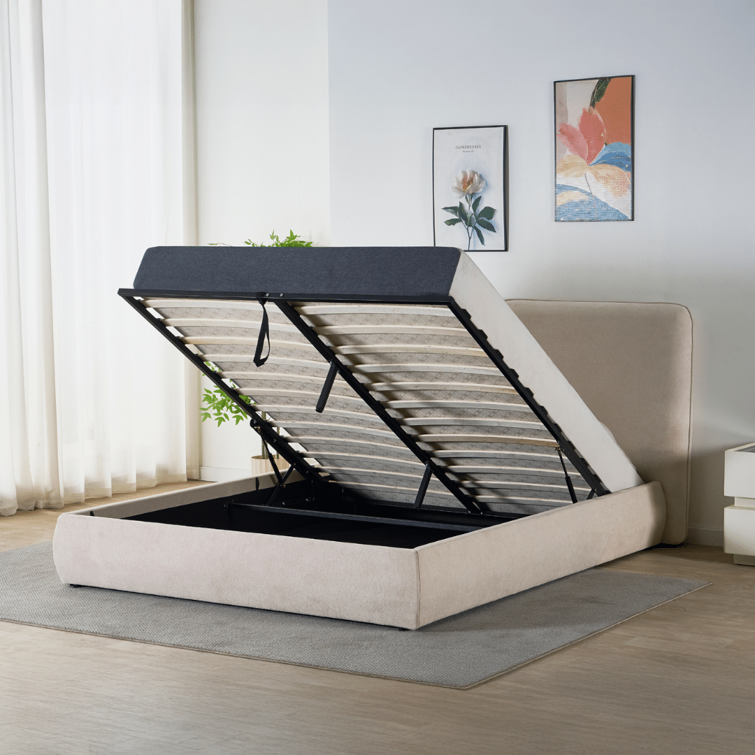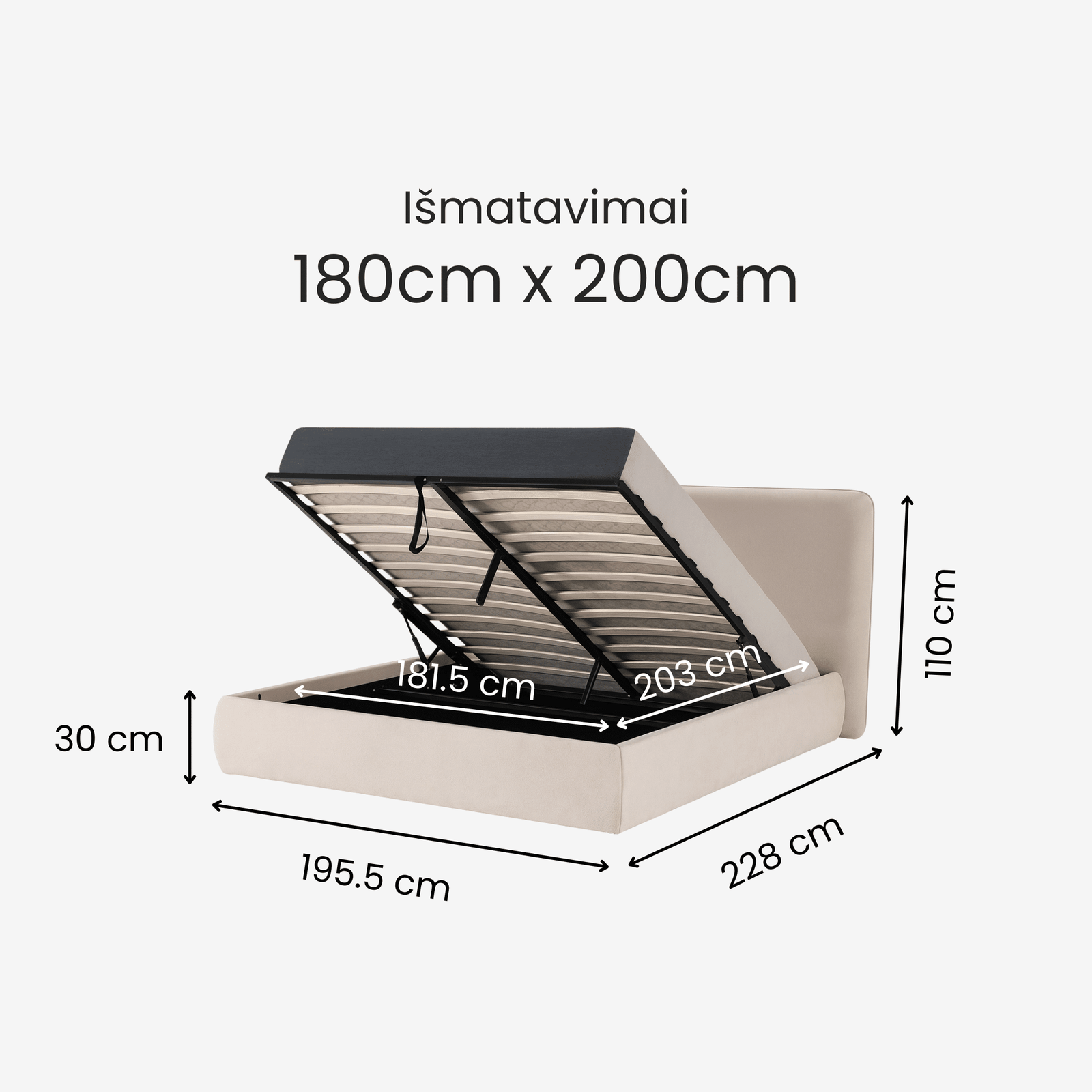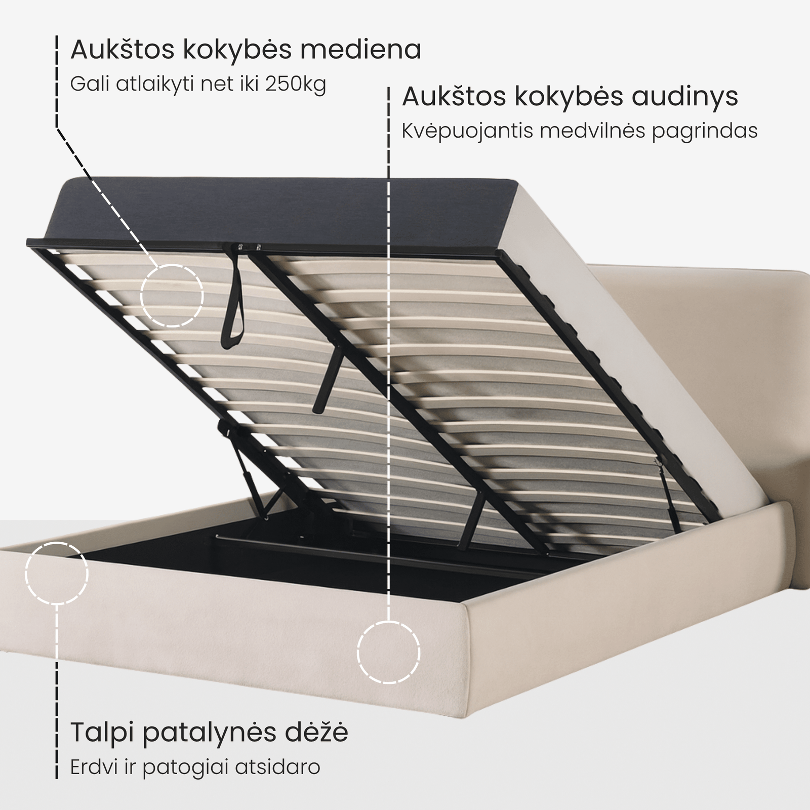 ✔ Dėl dujinių amortizatorių mechanizmo patalynės dėžę atidaryti lengva ir paprasta.