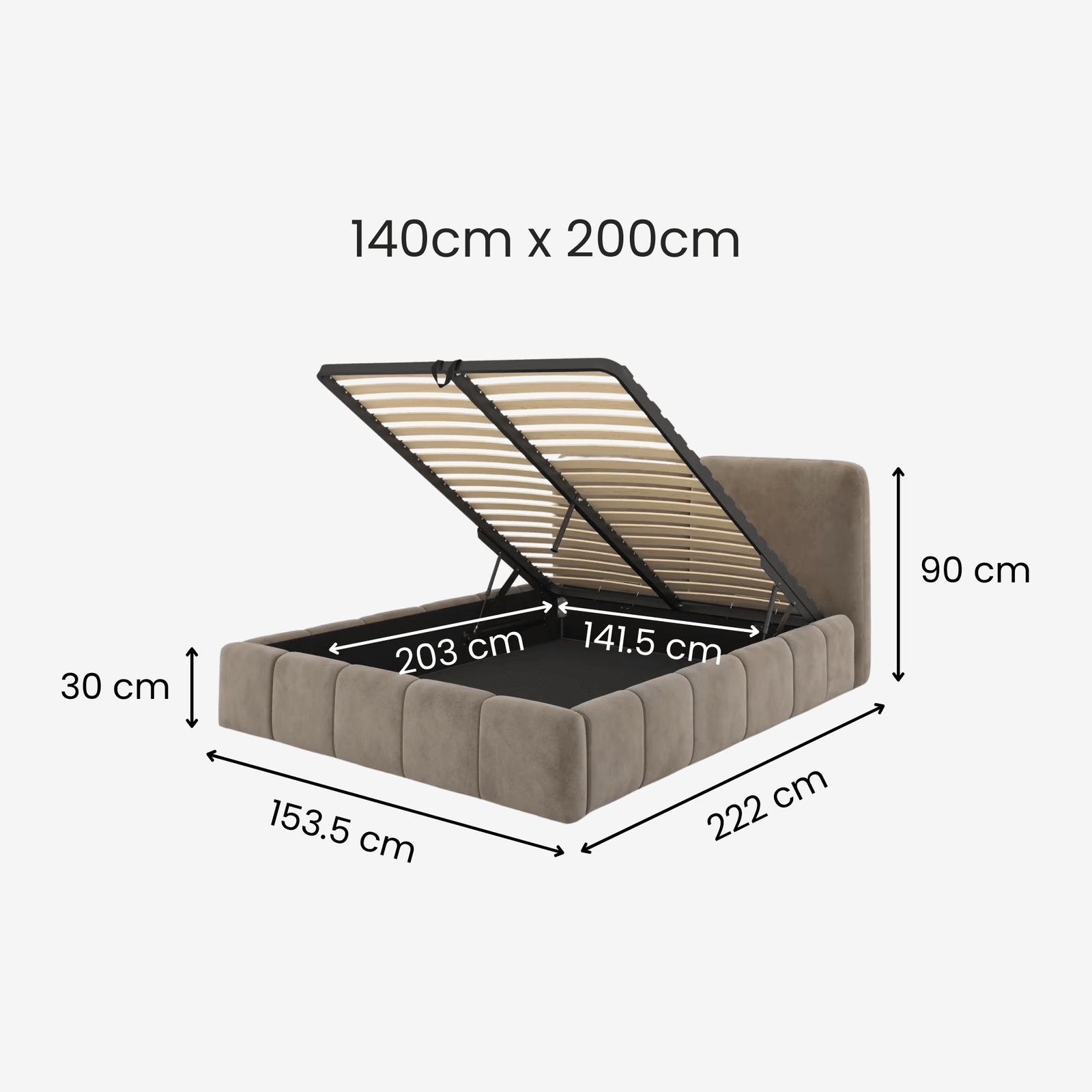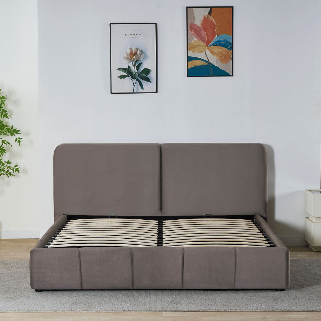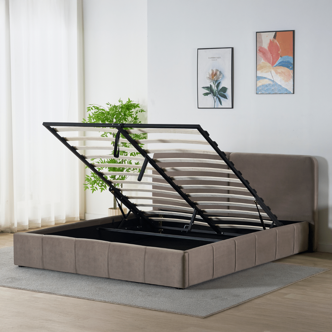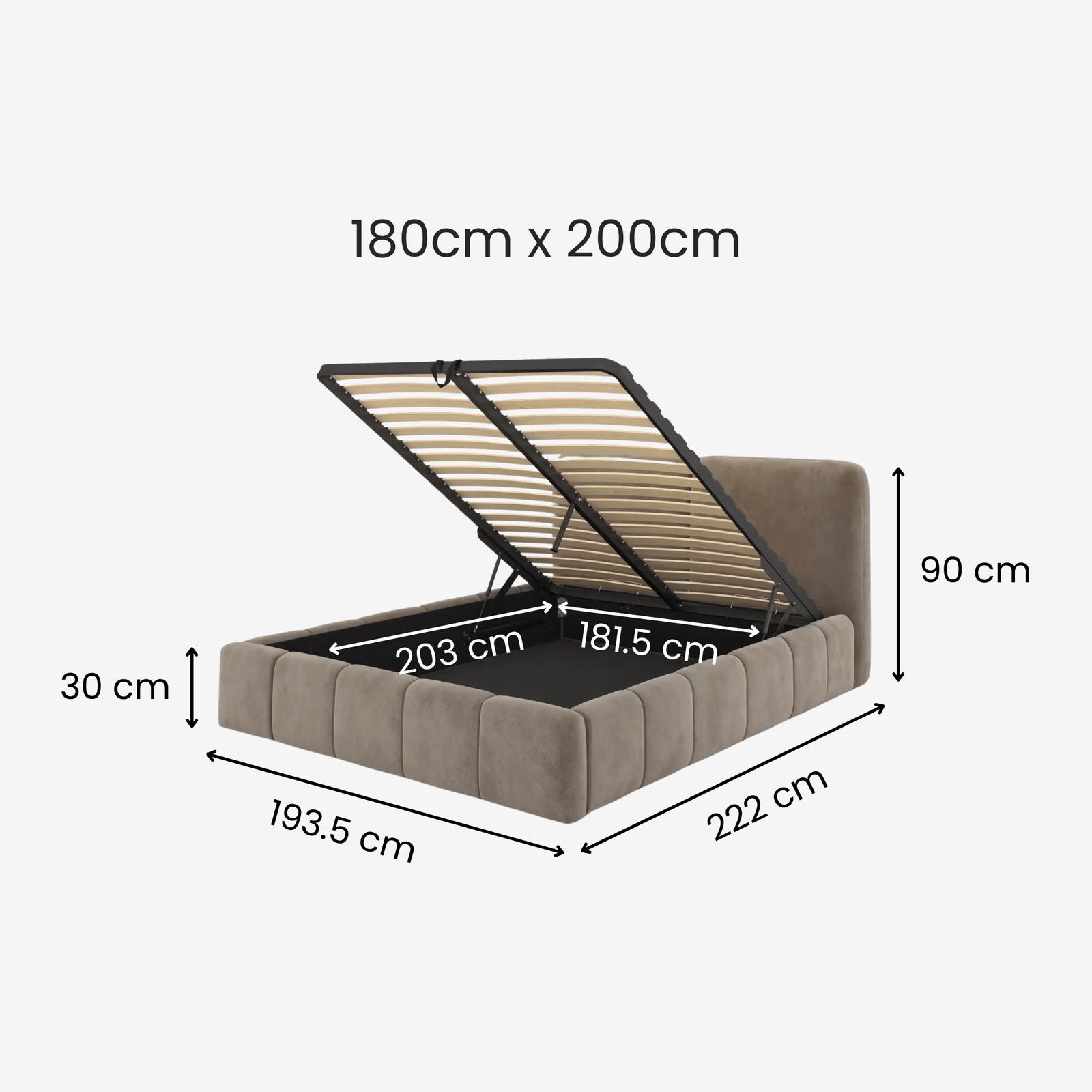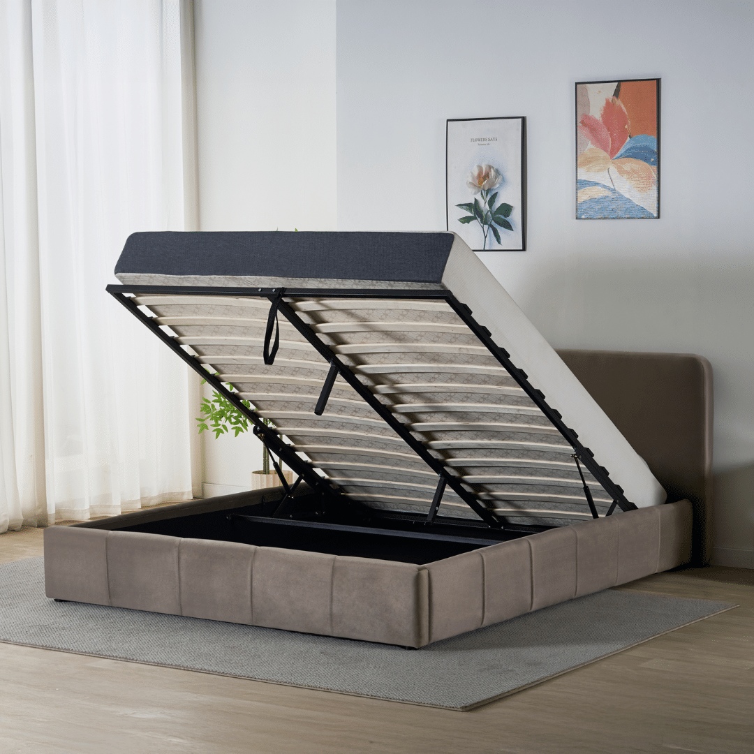 Tvirta medinė konstrukcija, šiuolaikiškas dizainas, minkštas paminkštintas rėmas ir talpi pakeliama daiktadėžė – viskas, ko reikia stilingam, patogiam ir tvarkingam miegamajam.