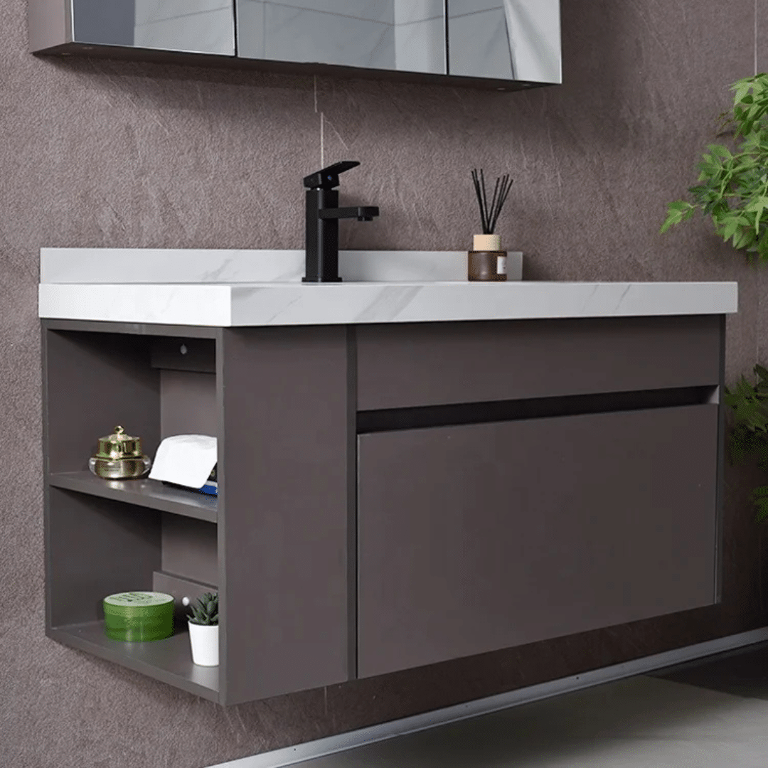2 šoninės lentynėlės, erdvus stalčius ir keraminis praustuvas su akmens stalviršiu suteiks vonios erdvei funkcionalumo ir subtilios estetikos.