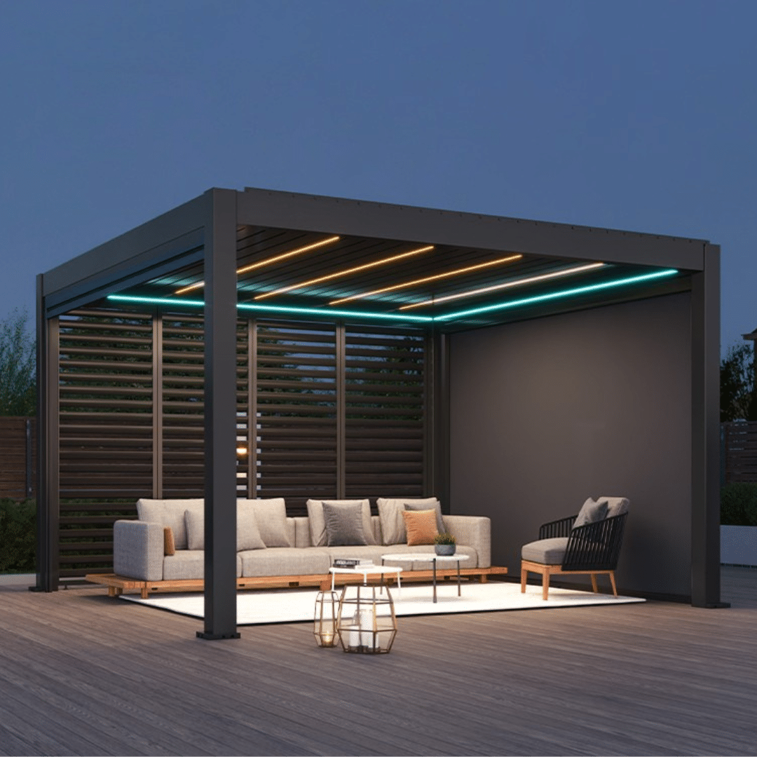 Mėgaukitės maksimalia komforto kontrole! Pergolos stogas su reguliuojamomis aliuminio lamelėmis leidžia pasirinkti, kiek saulės šviesos ar pavėsio norite. Karštomis dienomis jos užtikrina natūralią ventiliaciją, o užklupus lietui – visiškai sandariai užsidaro, apsaugodamos jus ir jūsų lauko erdvę.