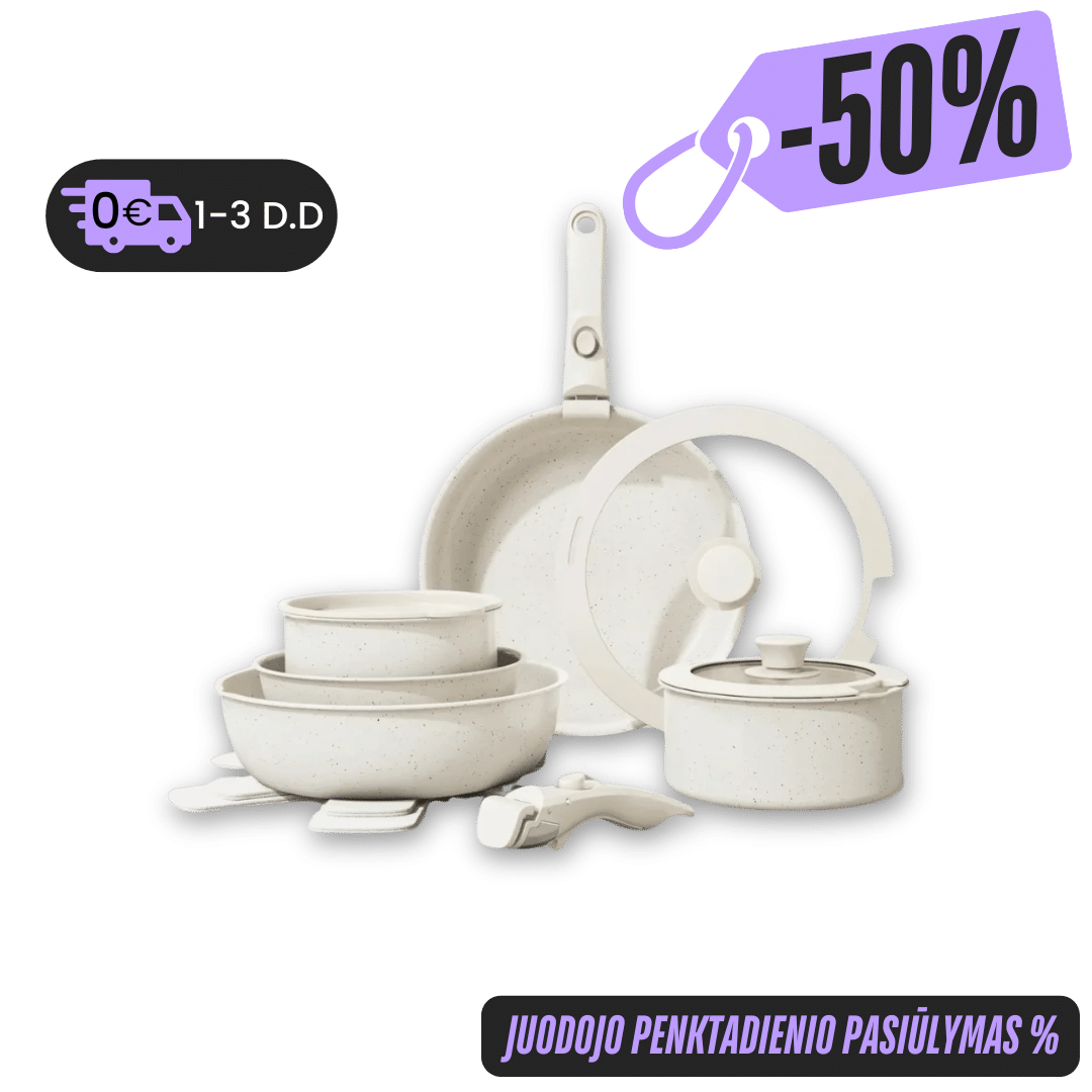 Labai patogus ir praktiškas keptuvių bei puodų rinkinys! Lengvas naudojimas, maistas nepridega, o priežiūra itin paprasta. Didelis pliusas – neužima daug vietos, nes viską galima sudėti vieną į kitą. Galima naudoti ir orkaitėje, o su nuimama rankena išimti indus labai paprasta – nereikia jokių pirštinių! Tikrai puikus pasirinkimas norintiems kokybiškos ir patogios virtuvės įrangos!