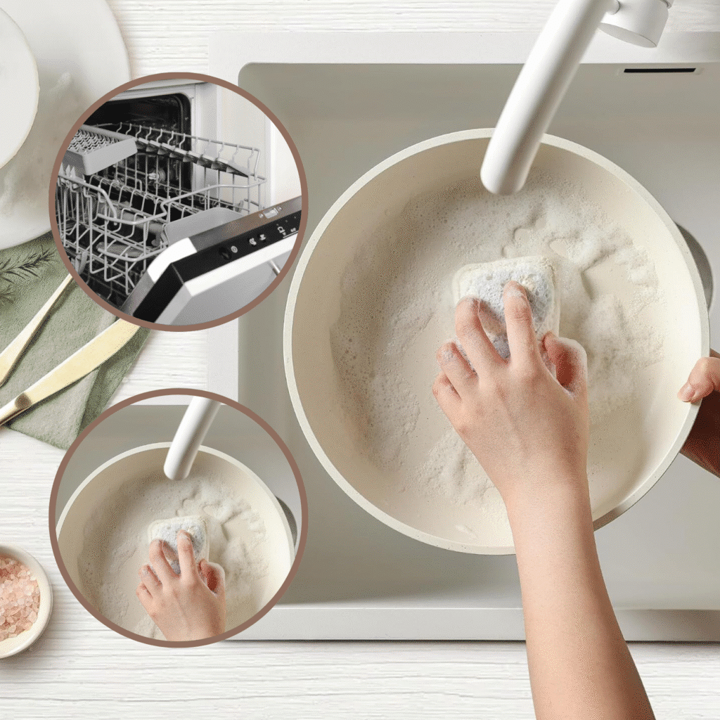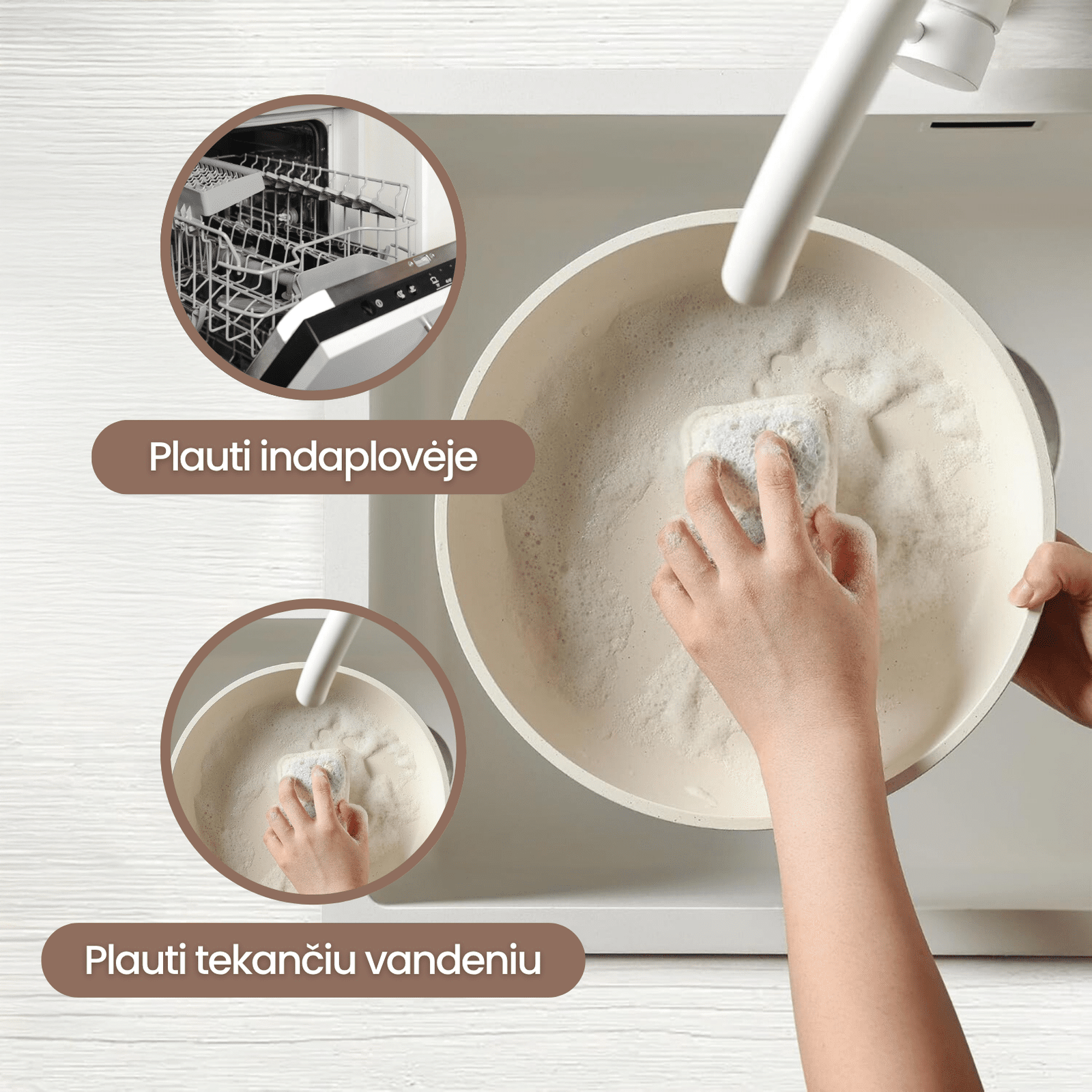 Po kepimo puodus bei keptuves prižiūrėti itin paprasta – nereikia ilgai šveisti ar naudoti stiprių valiklių. Tiesiog praskalaukite keptuvę po tekančiu vandeniu arba įdėkite ją į indaplovę.