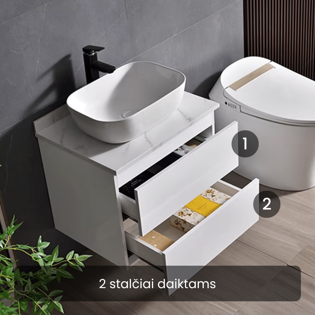 ✔ 2 talpūs stalčiai: patogiai sutalpinsite viską – nuo aksesuarų iki didesnių higienos priemonių ar prietaisų (pvz., plaukų džiovintuvą).